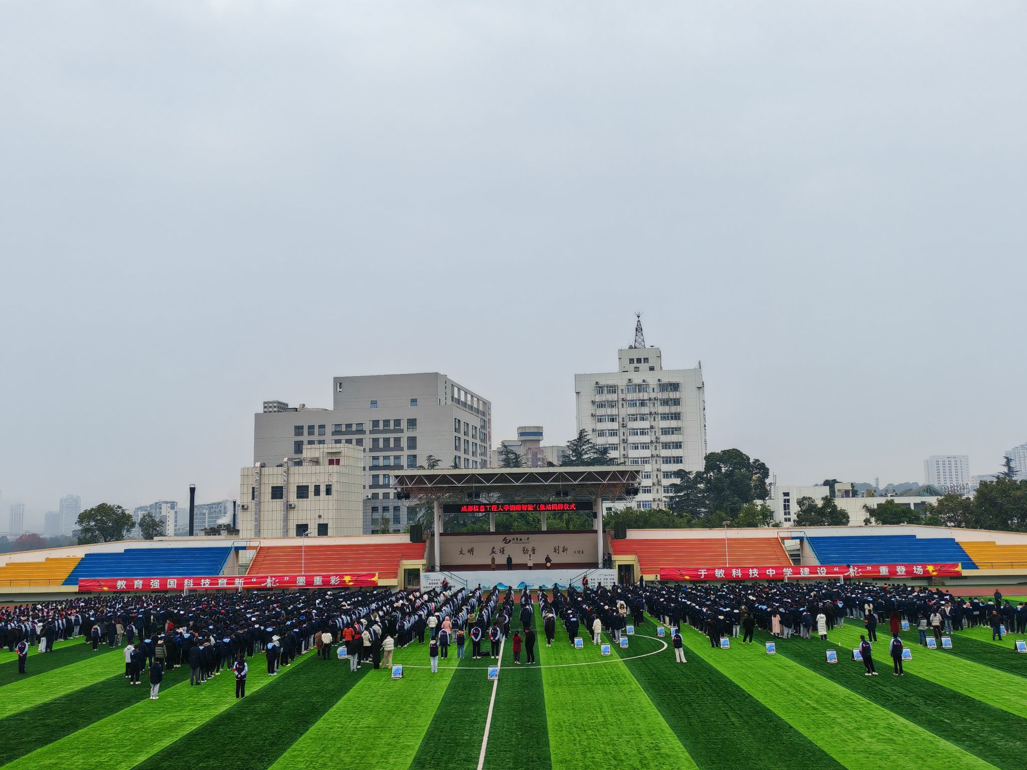 12月2日上午,成都信息工程大学校园智能气象站捐赠仪式在四川绵阳科学城一中体育场举行,成都信息工程大学电子工程学院(大气探测学院)党委书记缪燕平、副书记杨勇、学生科科长阮丽娜、四川省科学城一中党委书记邓友山等全体校领导、全体师生参加了此次捐赠仪式。